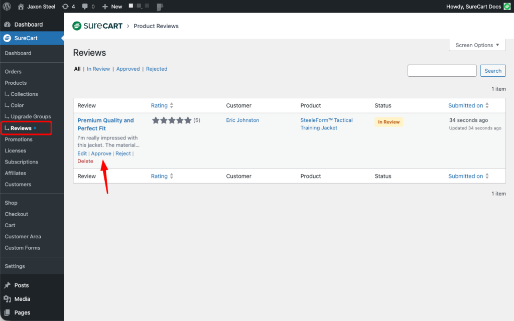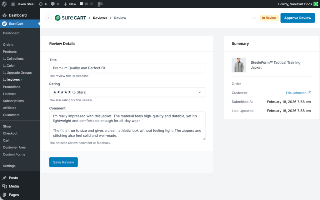 Clicking a review opens its detail page, where you can edit the title, modify the comment, change the rating, approve or reject, or delete.
