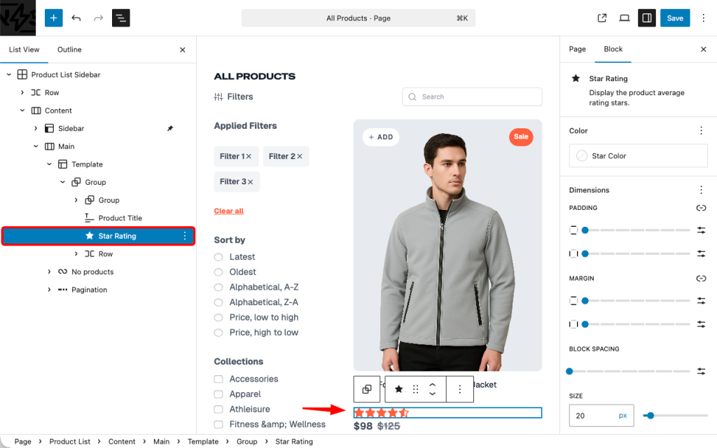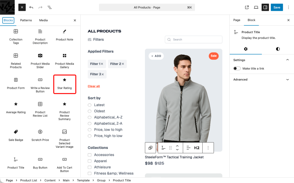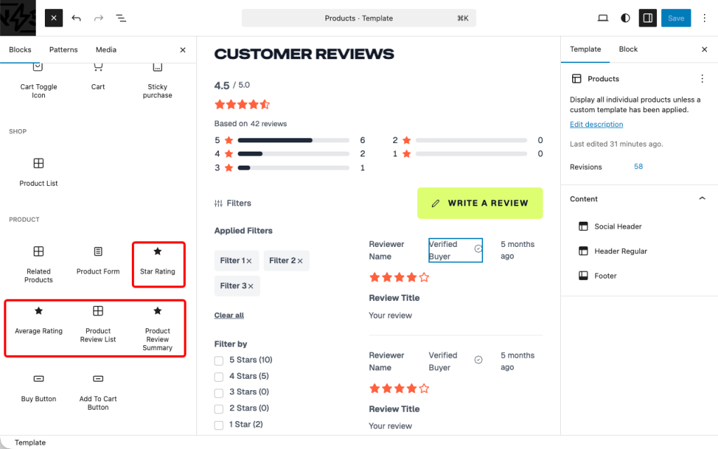 To display reviews on the frontend, add review blocks to your Single Product template.