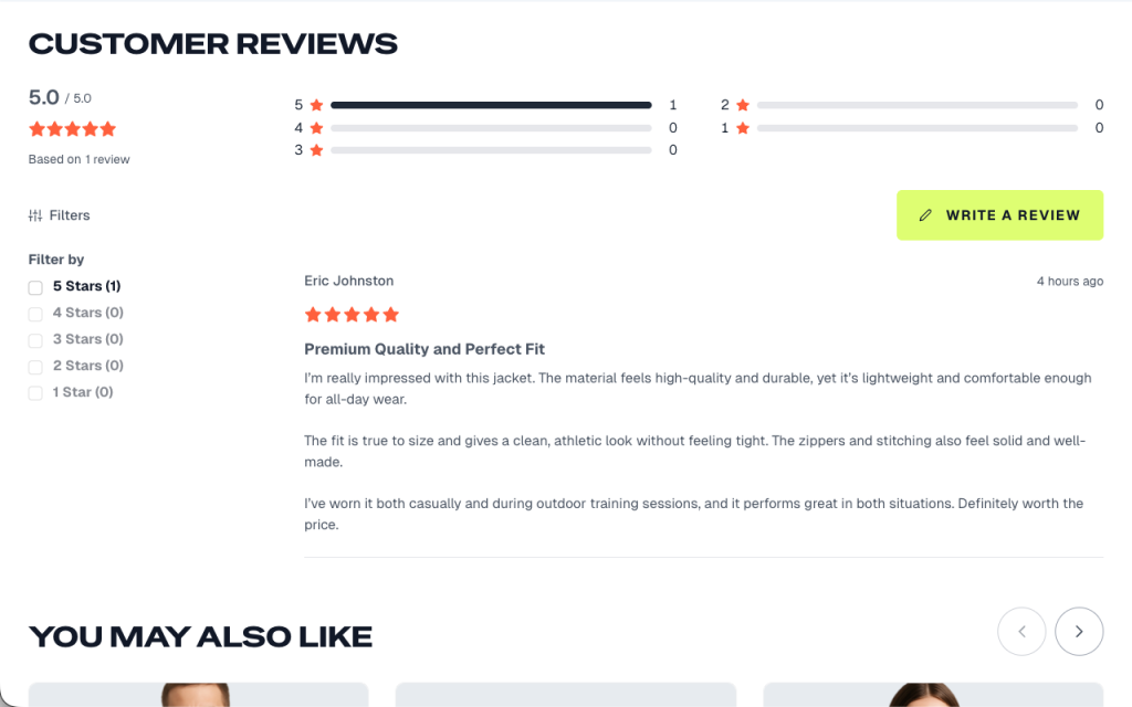 | Product Reviews | Displays the complete review section including summary, breakdown, filters, review list, and “Write a Review” button | Main review section on Single Product page |